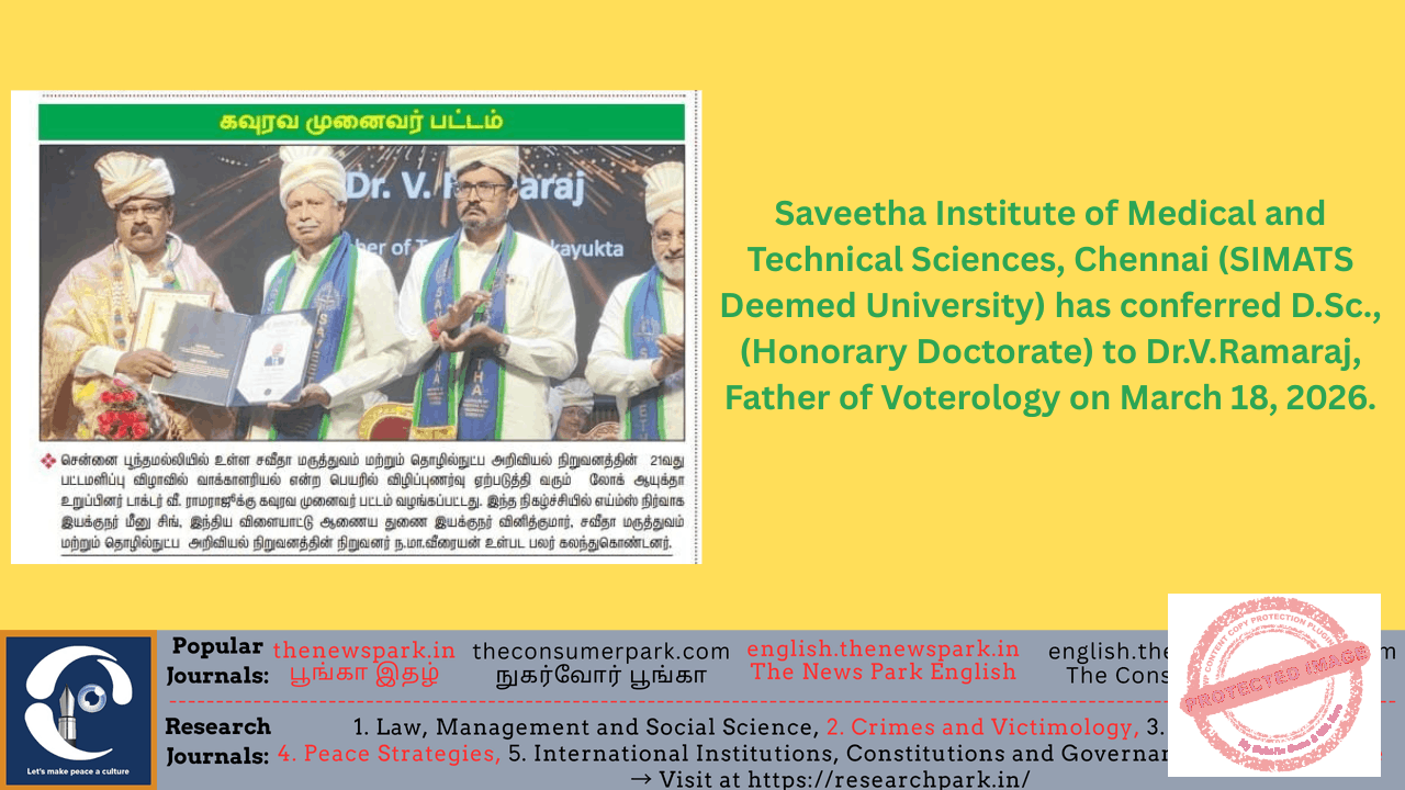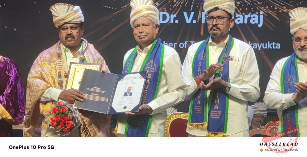 Saveetha Institute of Medical and Technical Sciences, Chennai (SIMATS Deemed University) has conferred D.Sc., (Honorary Doctorate) to Dr.V.Ramaraj, Father of Voterology on March 18, 2026.